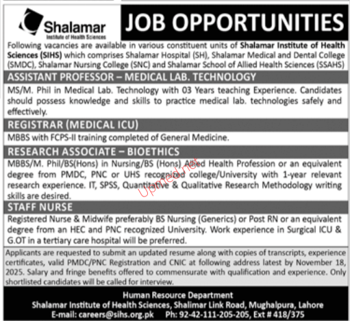 Institutes: Shalamar Institute of Health Sciences Lahore