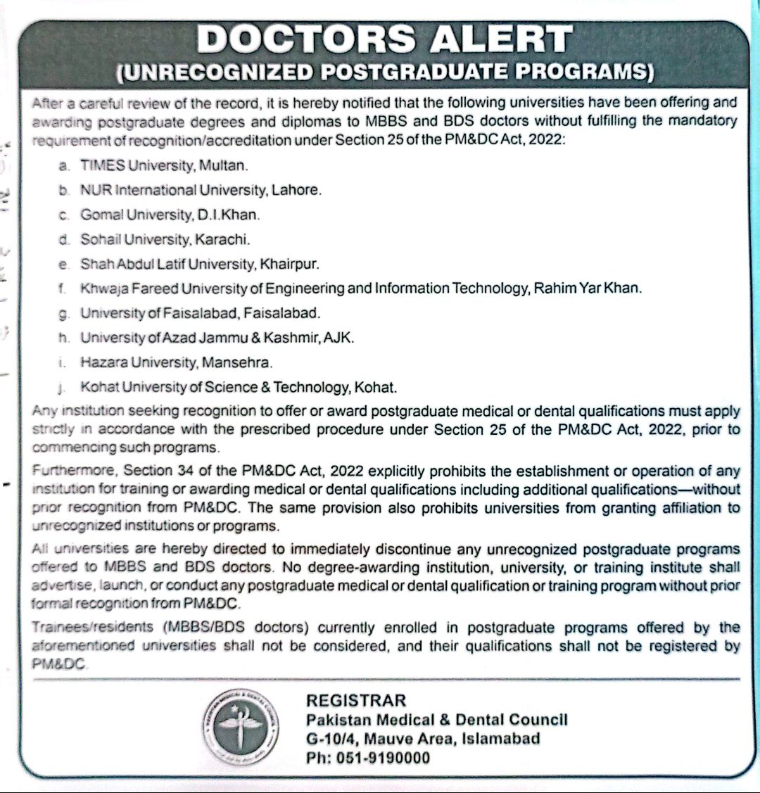 The Pakistan Medical & Dental Council (PM&DC) has issued a critical “Doctors Alert” regarding several universities offering postgraduate degrees and diplomas to MBBS and BDS doctors without legal recognition.